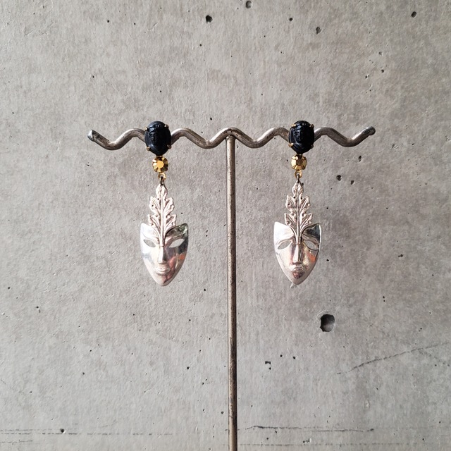 アンティーク時代から愛されているマスクモチーフ。全体のスッキリしたフォルムと洗練されたカラーが融合したエレガントなピアス。 ■年代/1970年代 ※一部現行パーツ ■仕入国>オランダ / 日本 ■素材>合金 / アクリル / ポストメッキ ■サイズ >全長約5.5cm / ヘッド約15×8mm大 ----------------------- 【取り扱い商品について】 当店は主にヴィンテージ(古物)パーツを使用した 商品を取り扱っております。 目立つキズや汚れ、褪せ、サビ、割れまた変色がある場合がございます。汚れに関しましては、可能な範囲でクリーニングしております。 古物の良さ、特徴として手を加えることのできない箇所につきましては、人々に長く愛用され時代と共に刻まれてきた、ヴィンテージの味わいと、ご理解ご了承頂ければ幸いです。 【ご使用上の注意点】 市販の磨き布などはご使用頂けません。ご着用後は直射日光の当たらない場所で保管してください。 入浴時、温泉、サウナまたスポーツ(ウィンタースポーツ含む)をされる際の着用はお止めください。 体質や体調により、アレルギー反応が出てしまった場合、肌に異常を感じた際はすぐにご着用をおやめ頂き、専門医にご相談下さい。