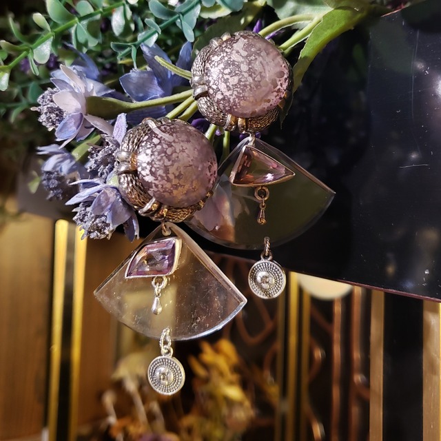 あどけないピュアな印象のある淡いカラーにそれぞれ個性あるフォルムのパーツが下がったイヤリング。大ぶりながら、透明感のあるパーツはとてもかろな印象。季節問わず一年を通してスタイリングを楽しめます。 ■年代/1960~2000年代 ■仕入国>フランス / アメリカ / 日本 ■素材>真鍮 / ルーサイト / シルバー925 / アクリル / ガラス / 天然石 ■サイズ >全長約8cm / ヘッド約3m大 ----------------------- 【取り扱い商品について】 当店は主にヴィンテージ(古物)パーツを使用した 商品を取り扱っております。 目立つキズや汚れ、褪せ、サビ、割れまた変色がある場合がございます。汚れに関しましては、可能な範囲でクリーニングしております。 古物の良さ、特徴として手を加えることのできない箇所につきましては、人々に長く愛用され時代と共に刻まれてきた、ヴィンテージの味わいと、ご理解ご了承頂ければ幸いです。 【ご使用上の注意点】 市販の磨き布などはご使用頂けません。ご着用後は直射日光の当たらない場所で保管してください。 入浴時、温泉、サウナまたスポーツ(ウィンタースポーツ含む)をされる際の着用はお止めください。 体質や体調により、アレルギー反応が出てしまった場合、肌に異常を感じた際はすぐにご着用をおやめ頂き、専門医にご相談下さい。