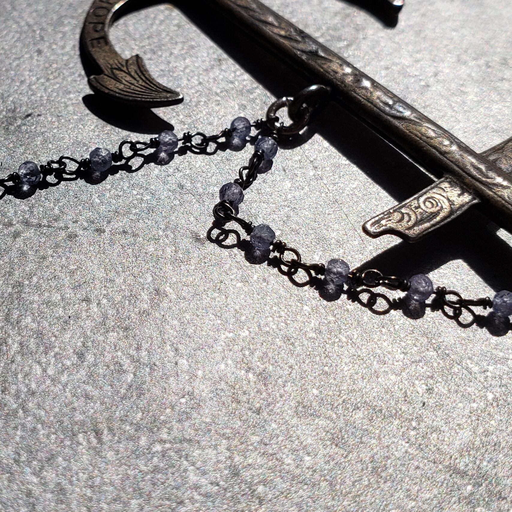 ブラウンカラーガラスとラベンダーカラーのタンザナイトストーンで個性の強いモチーフもお洒落にカッコよくご着用いただけます。