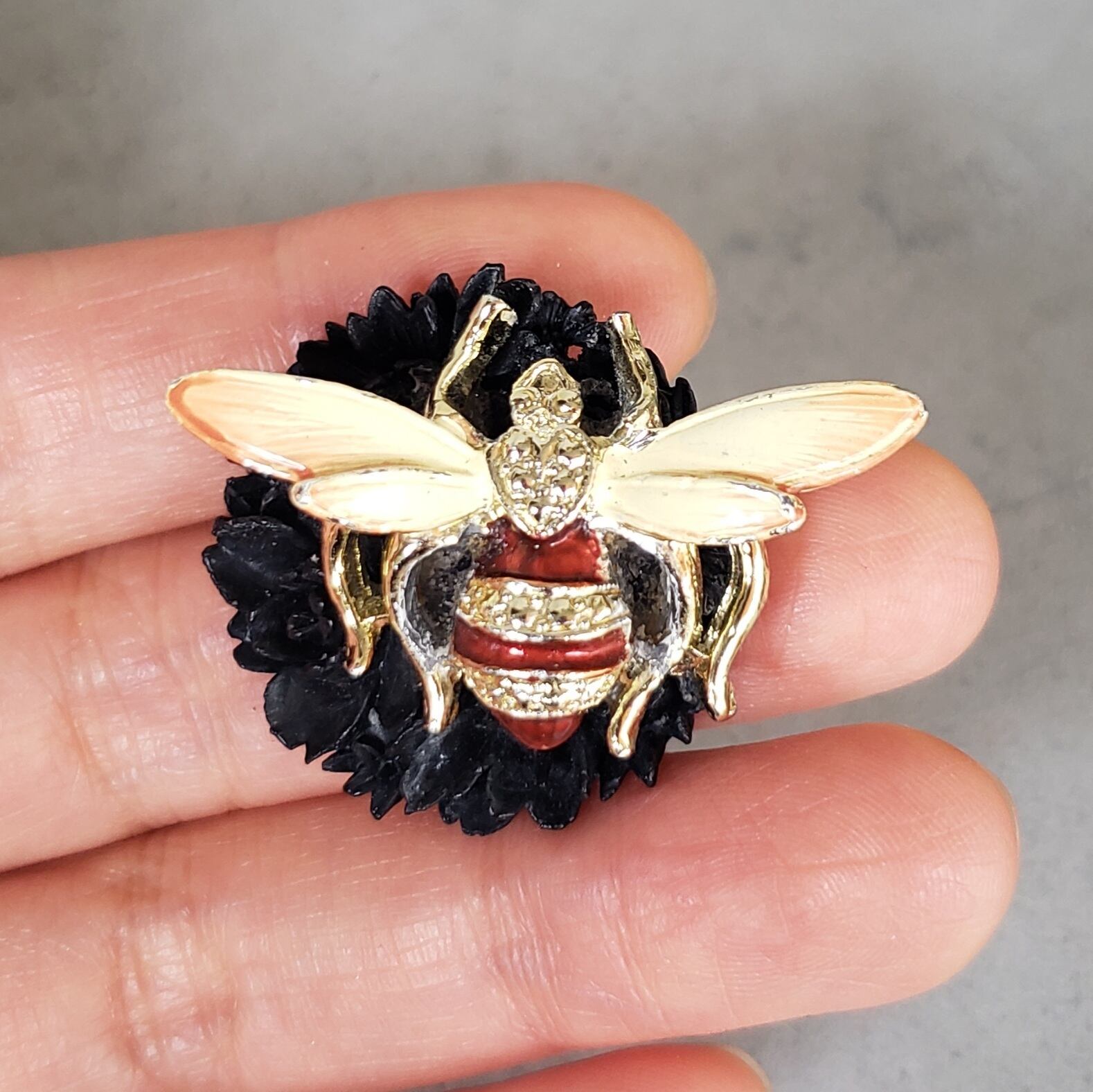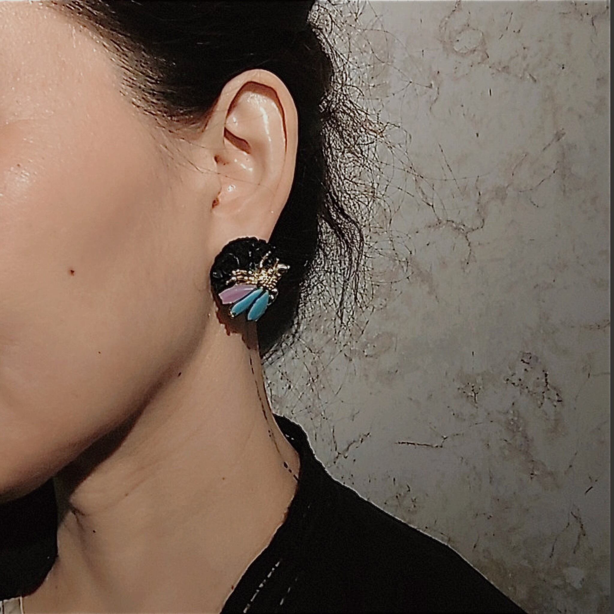 漆黒マットな半立体カボションにパッと鮮やかなカラーの虫モチーフが留まったダークファンタジーなピアスです。