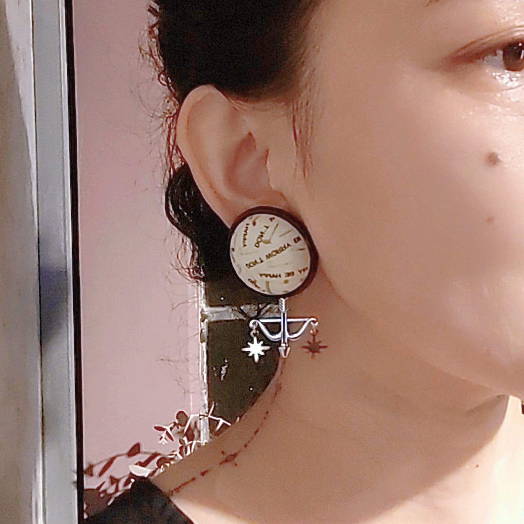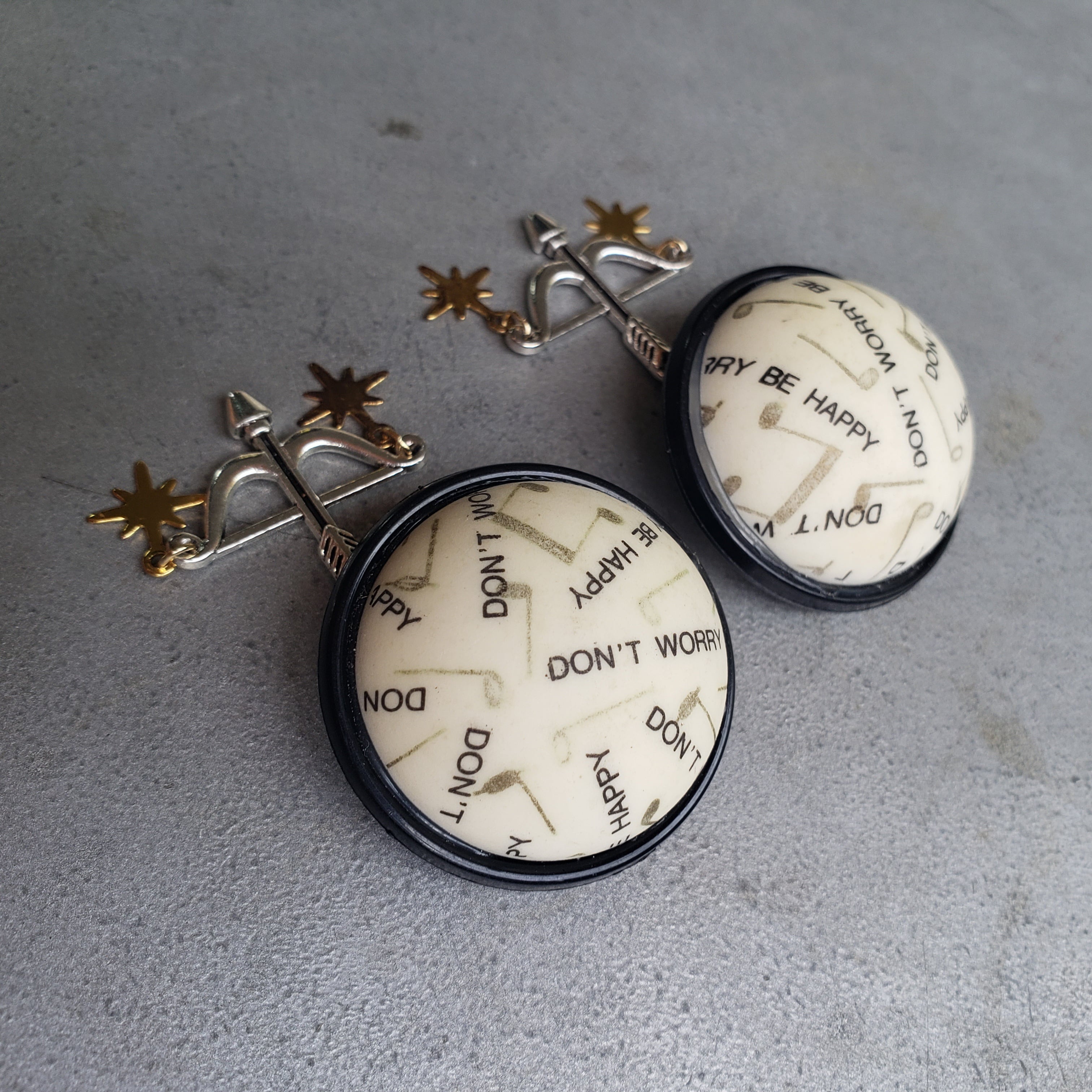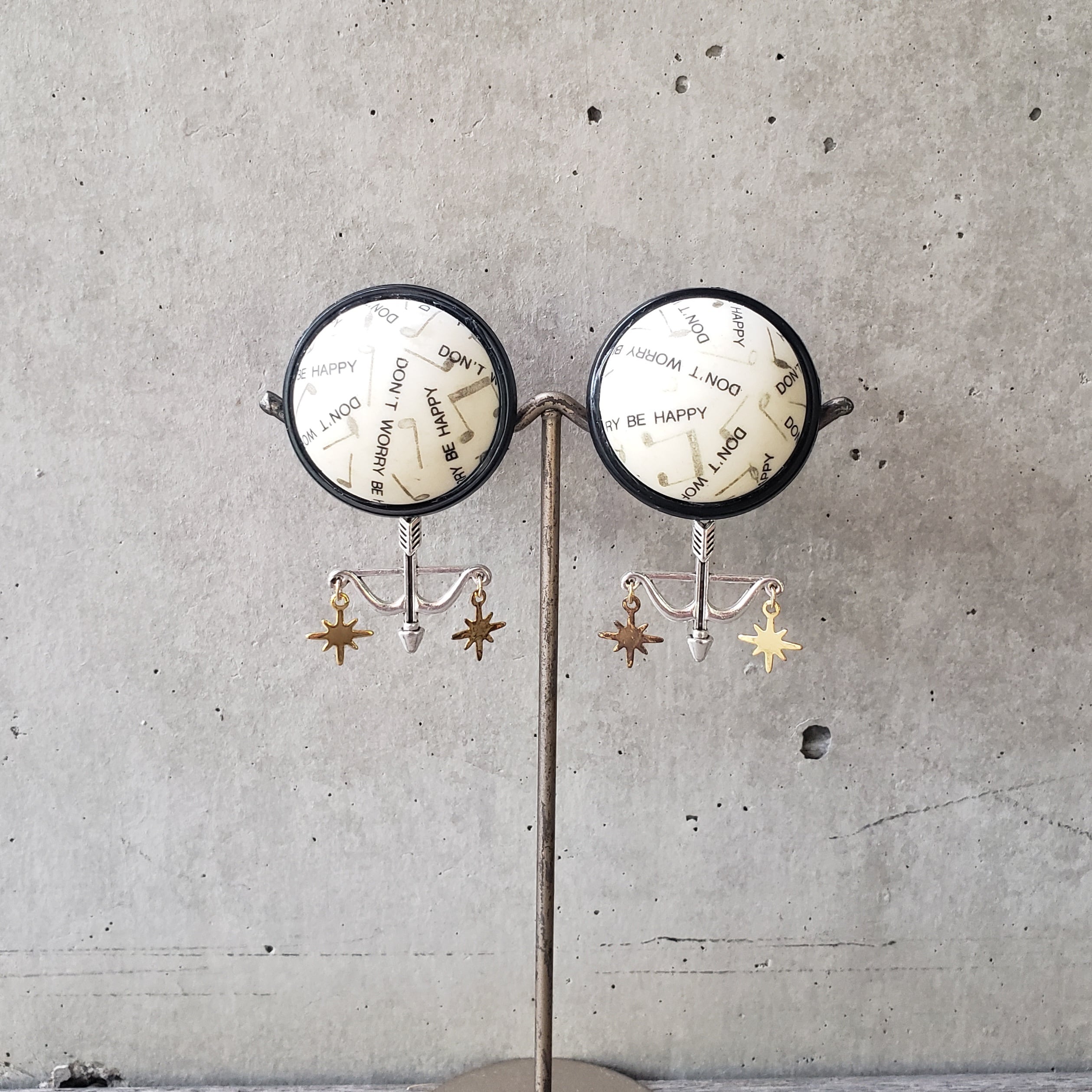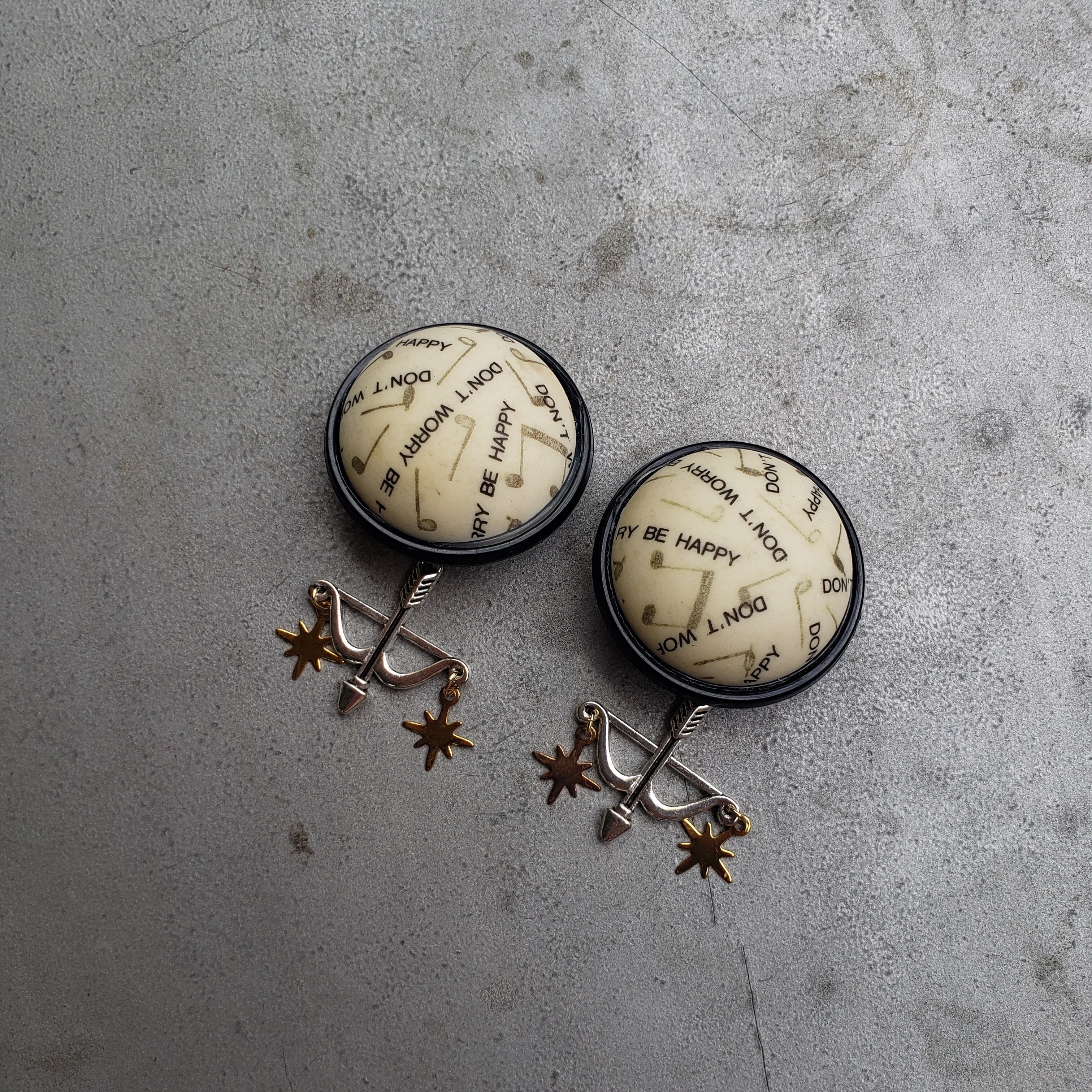 スタンダードなプラスチックカボションに音符とメッセージがプリントされた、音楽に縁のある方にぴったりの楽しいイヤリング。