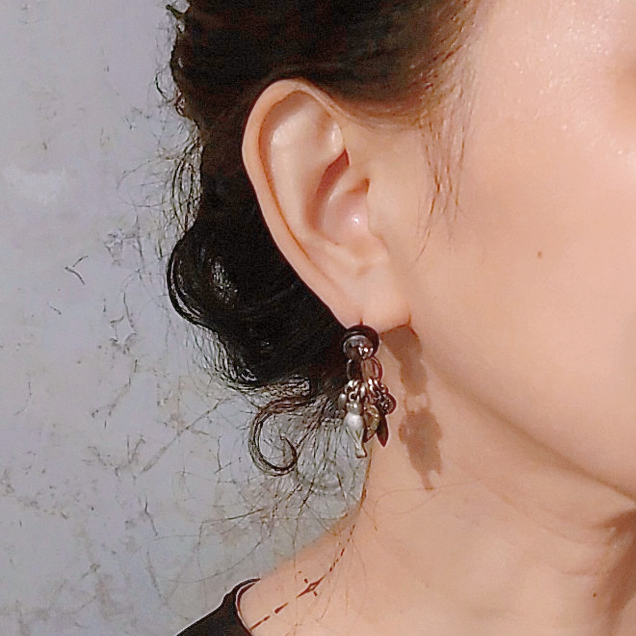 プチモチーフが贅沢にあしらわれ、ちょうどいいじゃらじゃら感と、小ぶりながらちゃんとボヘミアンなスタイルがかわいらしい!デイリーに着けやすいピアスです。