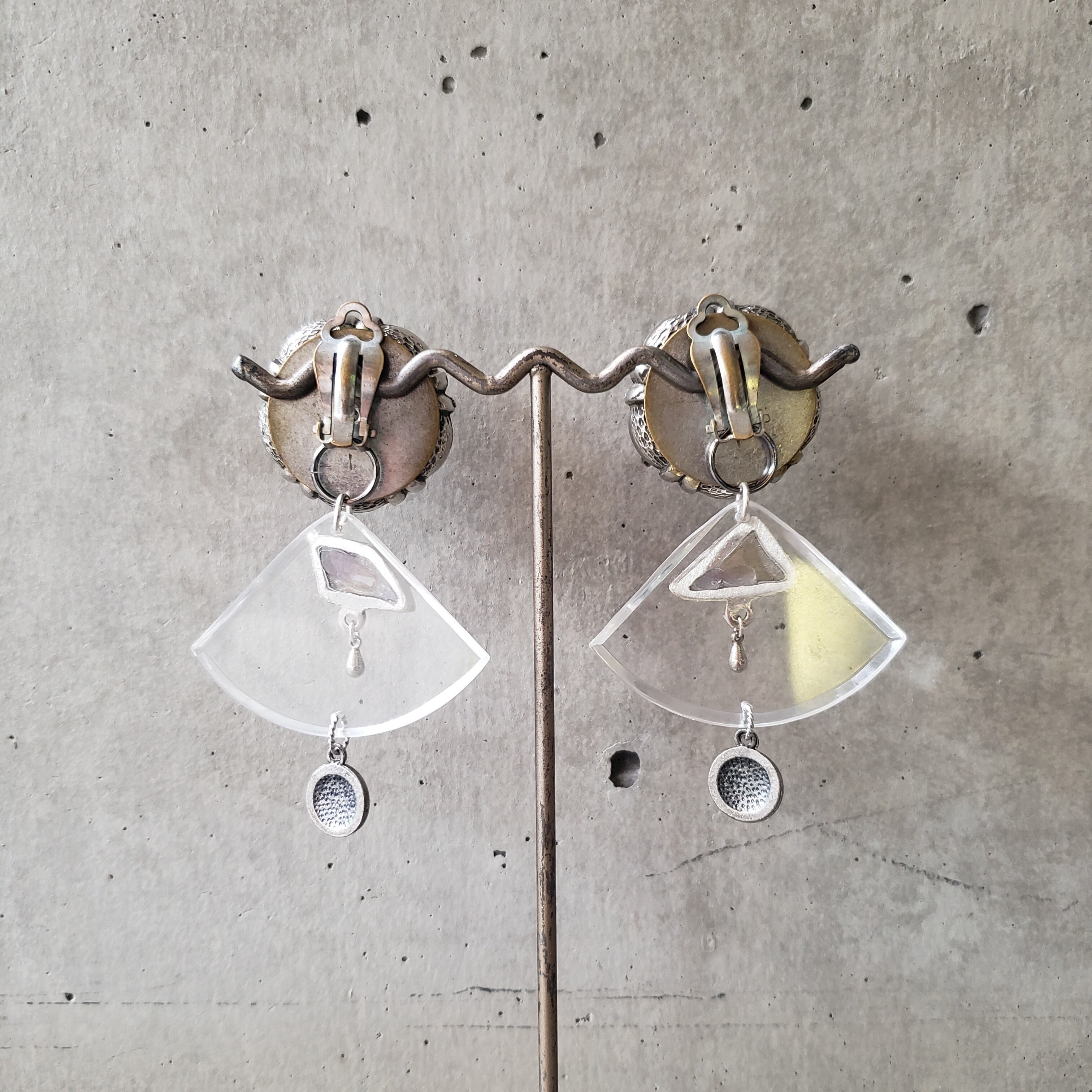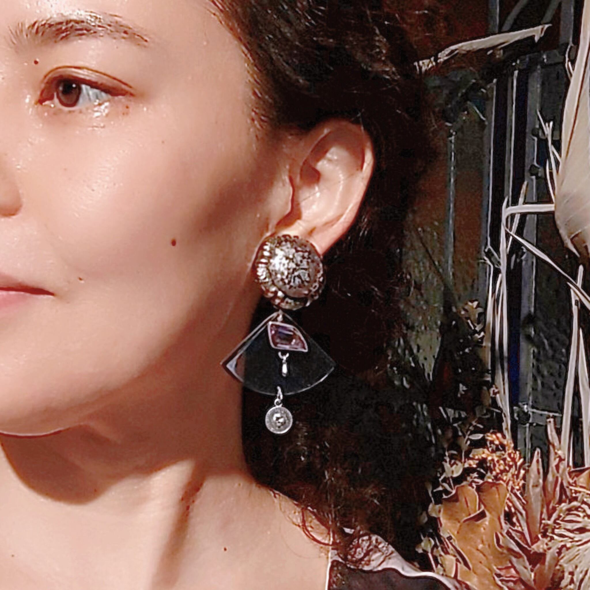 あどけないピュアな印象のある淡いカラーにそれぞれ個性あるフォルムのパーツが下がったイヤリング。大ぶりながら、透明感のあるパーツはとてもかろな印象。季節問わず一年を通してスタイリングを楽しめます。