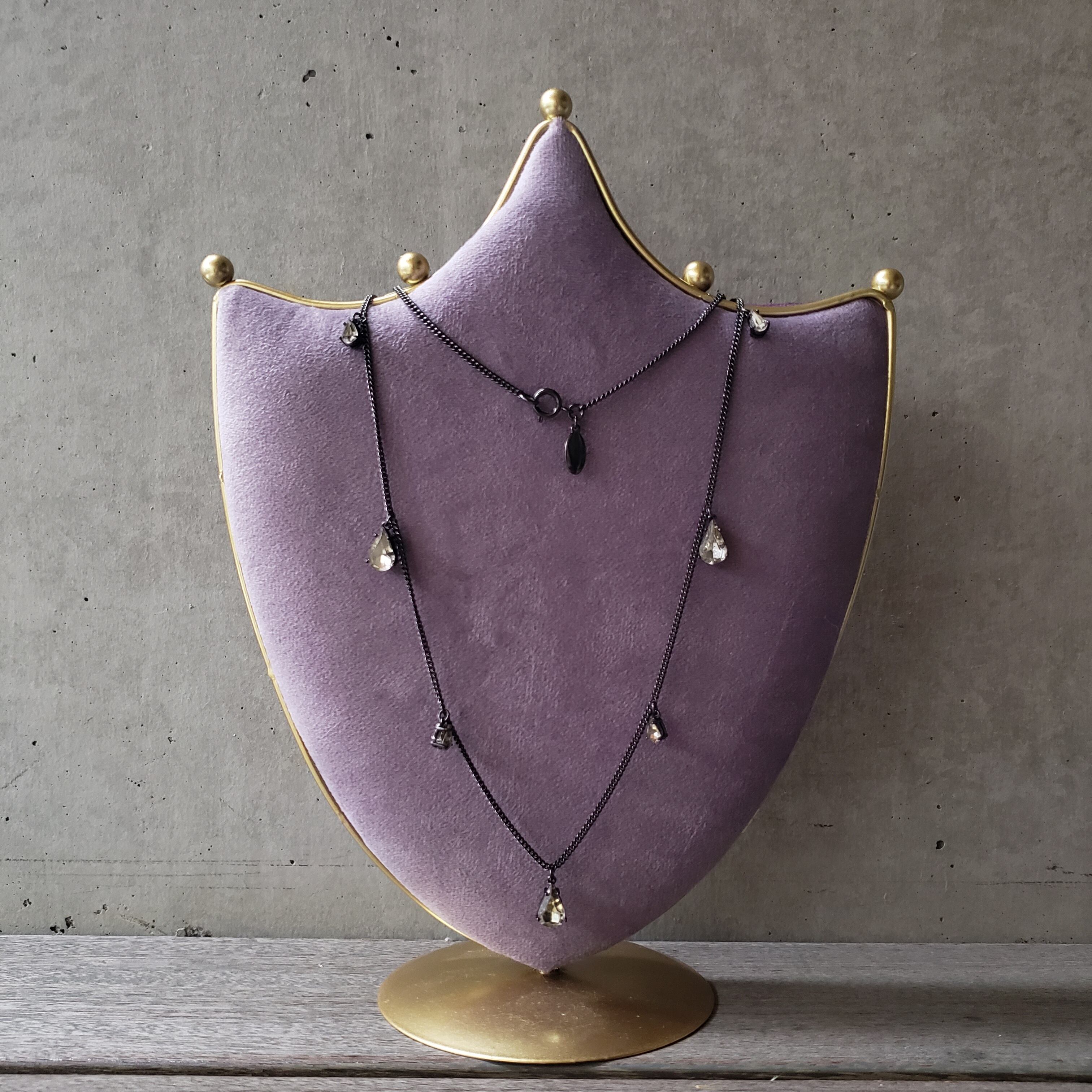 ほんのりスモーキーなクリスタルガラスがシンメトリーに下げられたシンプルながらニュアンスが効いたネックレス。