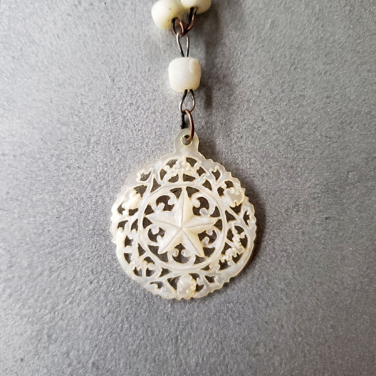 ネックレス部分もマザーオブパールのビーズでひとつひとつ繋がれているこちらの一体型ペンダントネックレスはなかなかお目にかかれません。