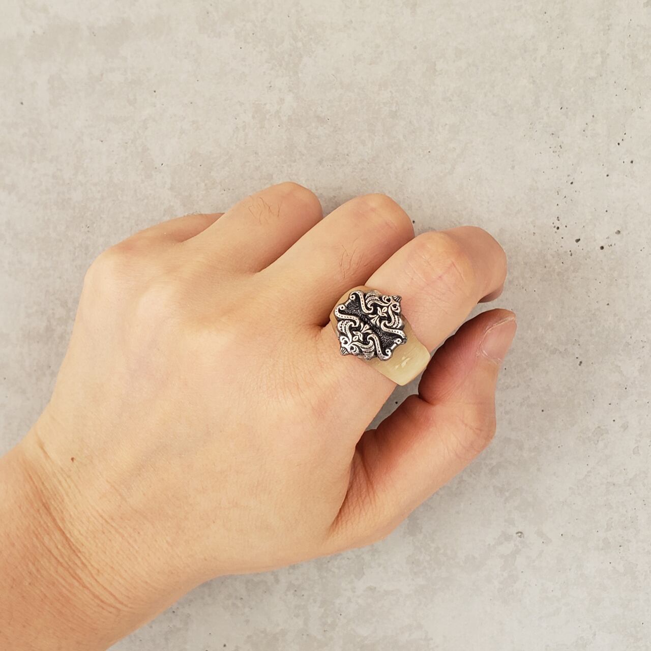 自然素材んリングとパーツを組み合わせた目を惹く、心躍る1点もの!