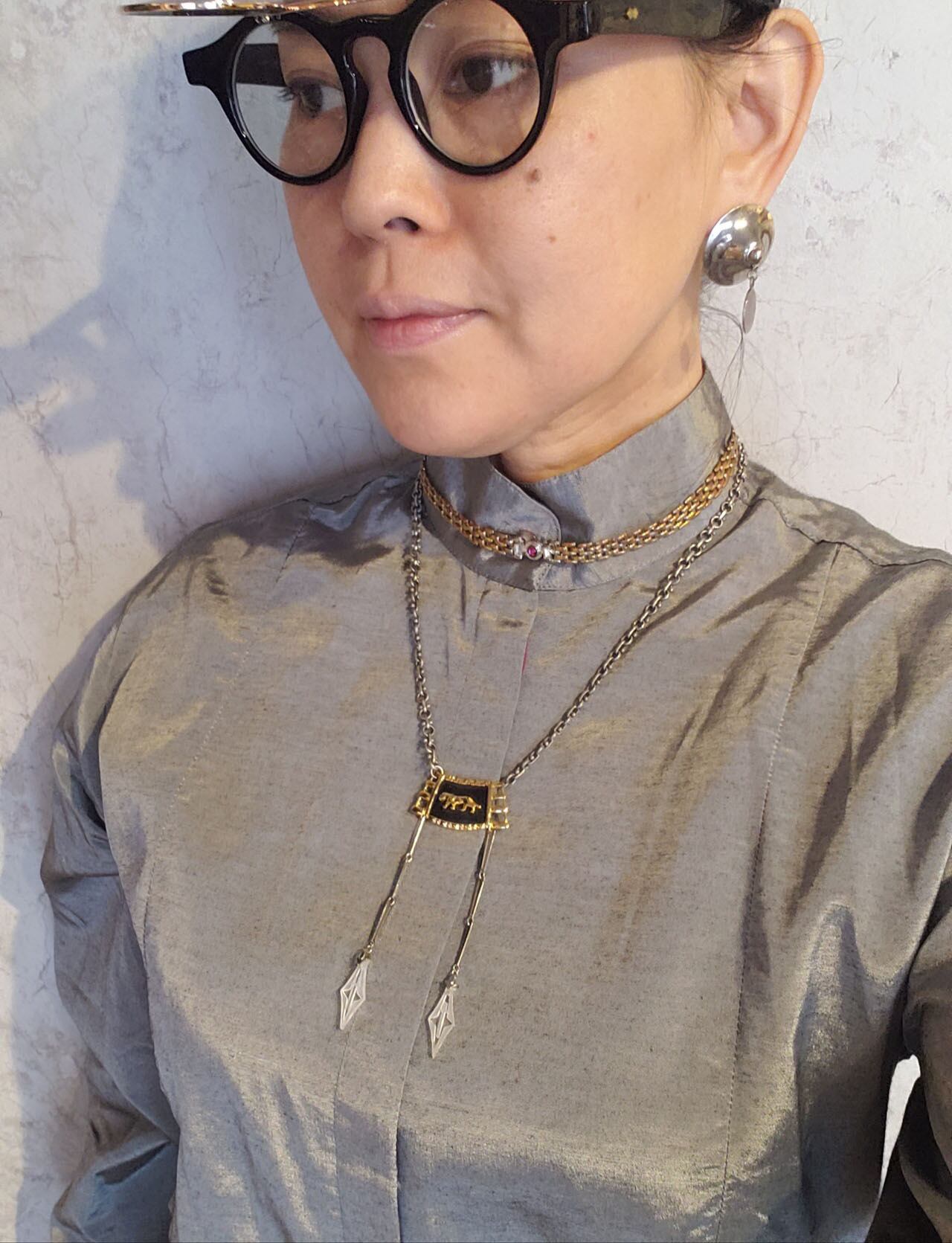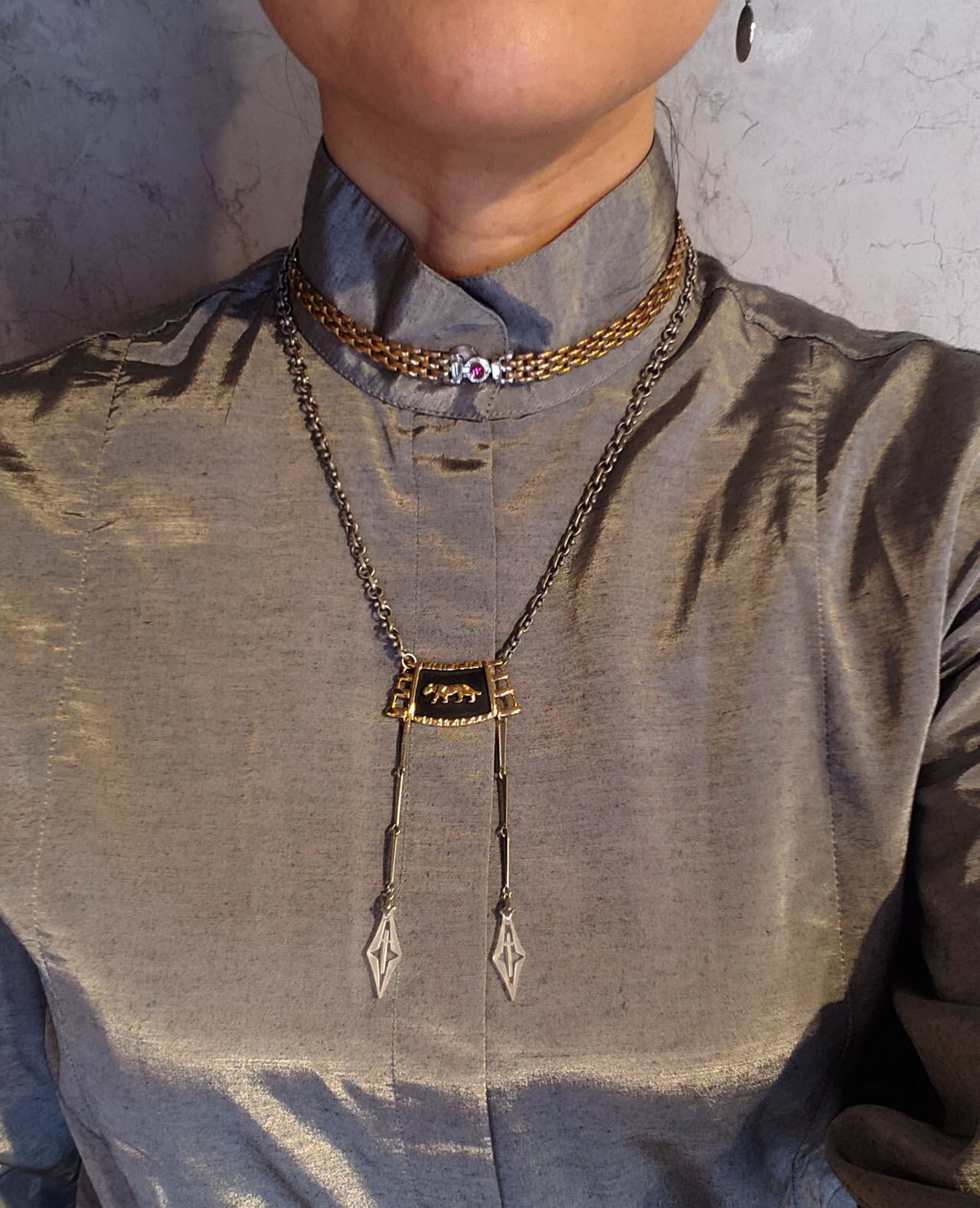 またその中に見えるピンクめいた銅色やパキットクールなロジウムカラーなど、味わい深いコンビカラーメタルをたっぷり楽しんで頂けるスタイリーなデザインネックレス。