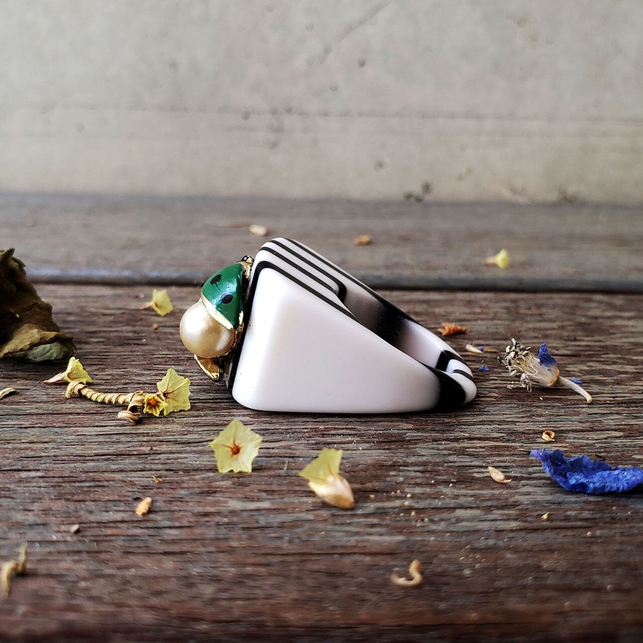 CR-0044 / 1940-60's / France & U.S. / 白黒緑 / お散歩てんとう虫 / Lucite / Vintage コンボ Ring