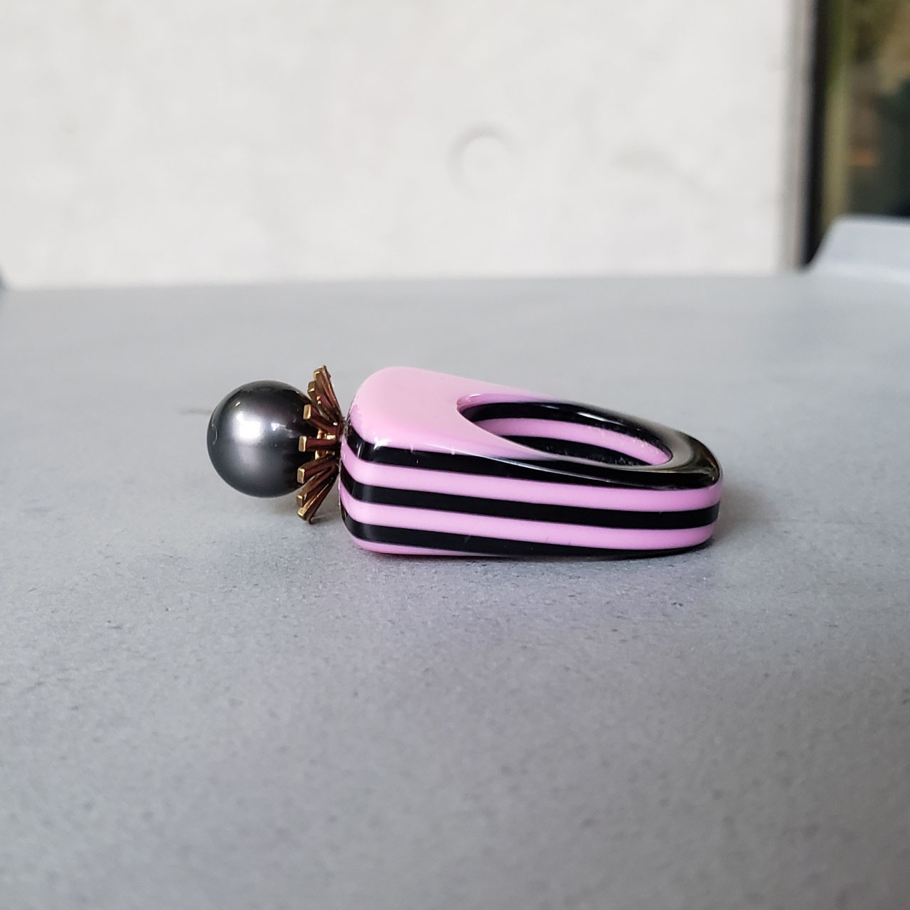 CR-0095 / U.S. / Israel / ピンク&ブラックボーダー / ルーサイト / ブラック貝パール / Vintage combo ring